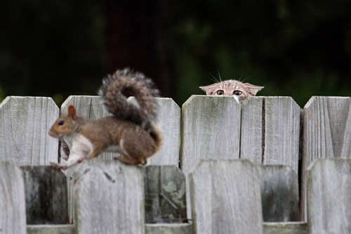 Một con mèo đang quan sát một con sóc đang di chuyển trên bờ rào ở bãi biển Ormond, Floria (ngày 08/9)